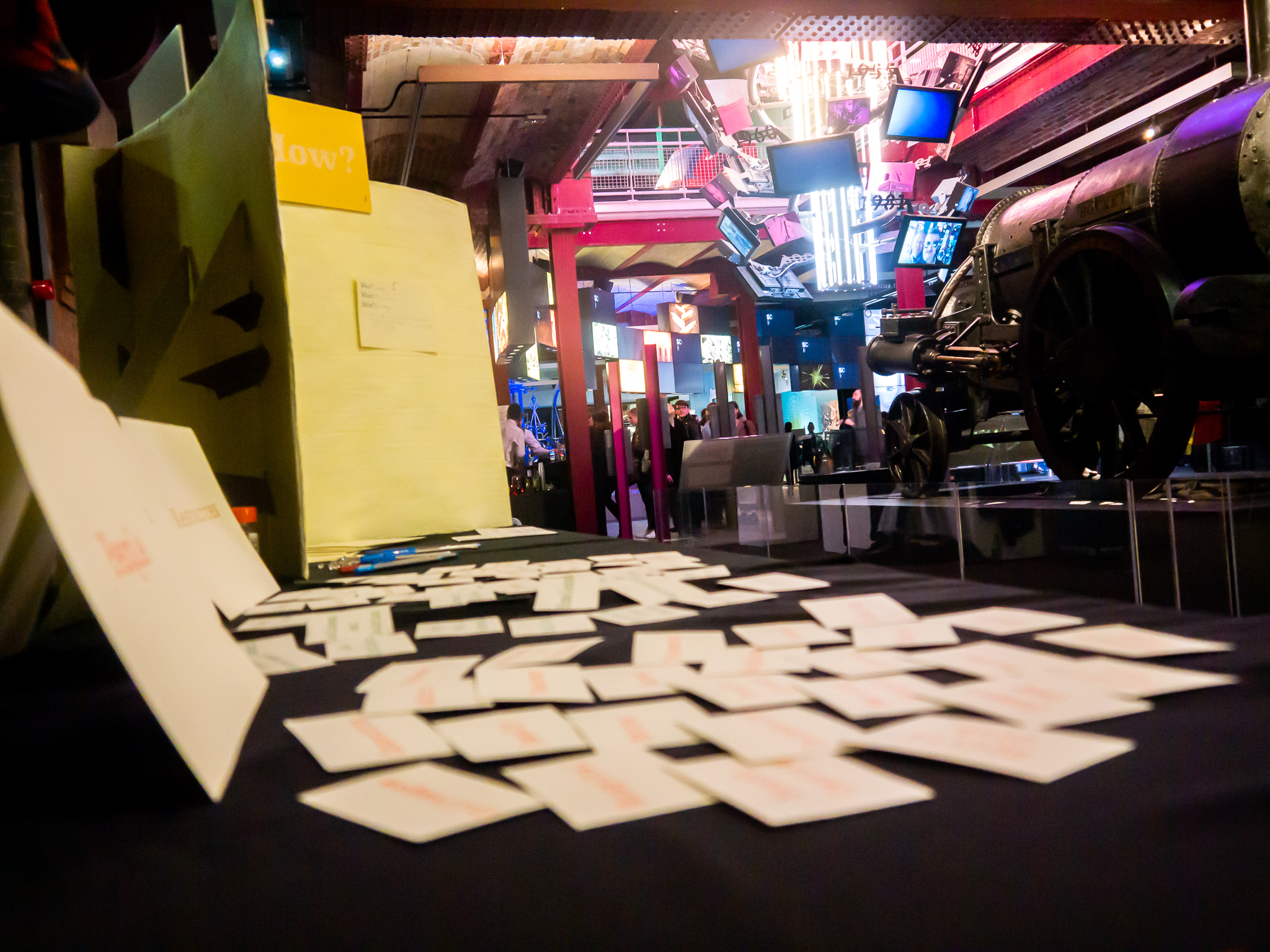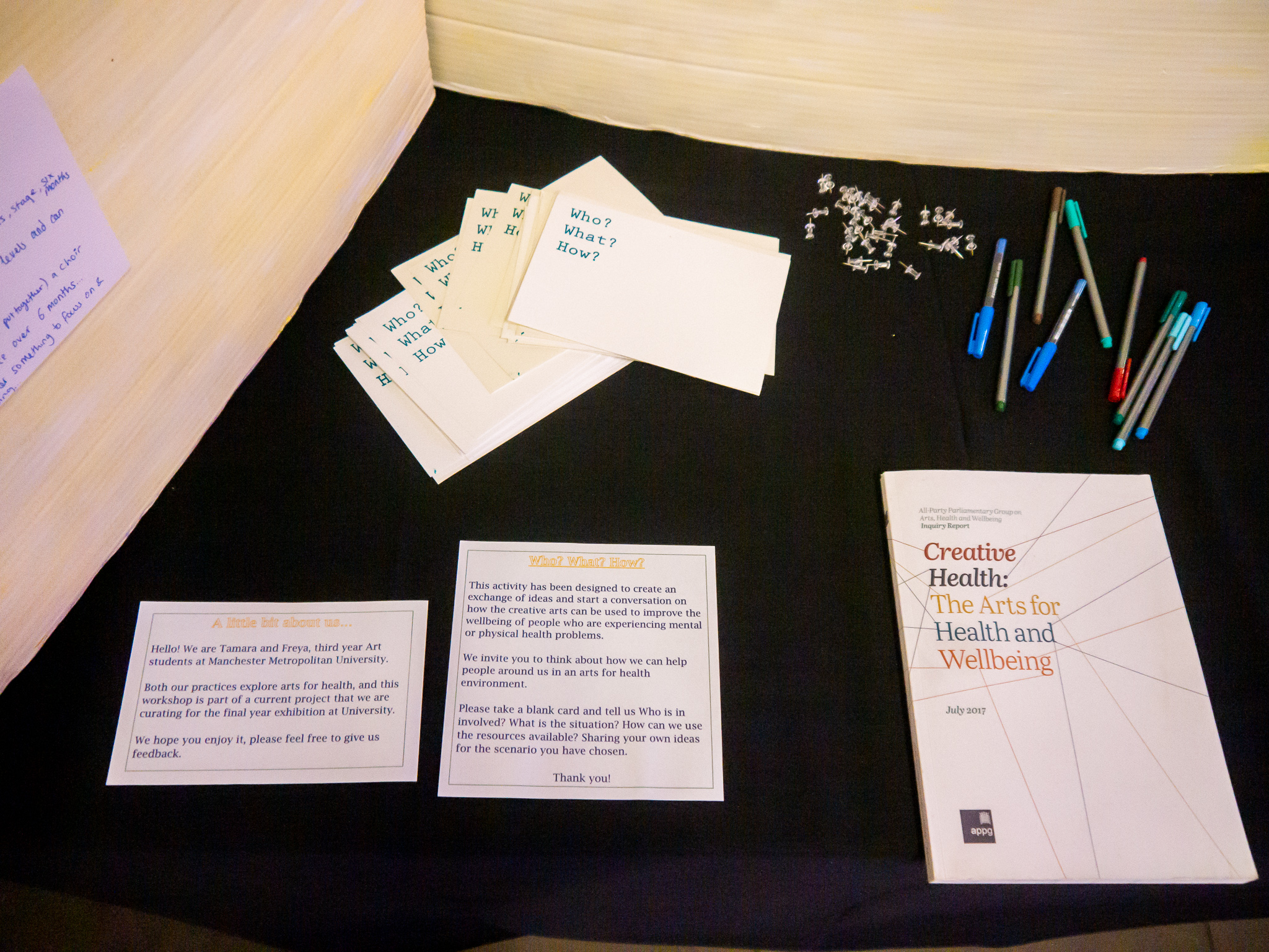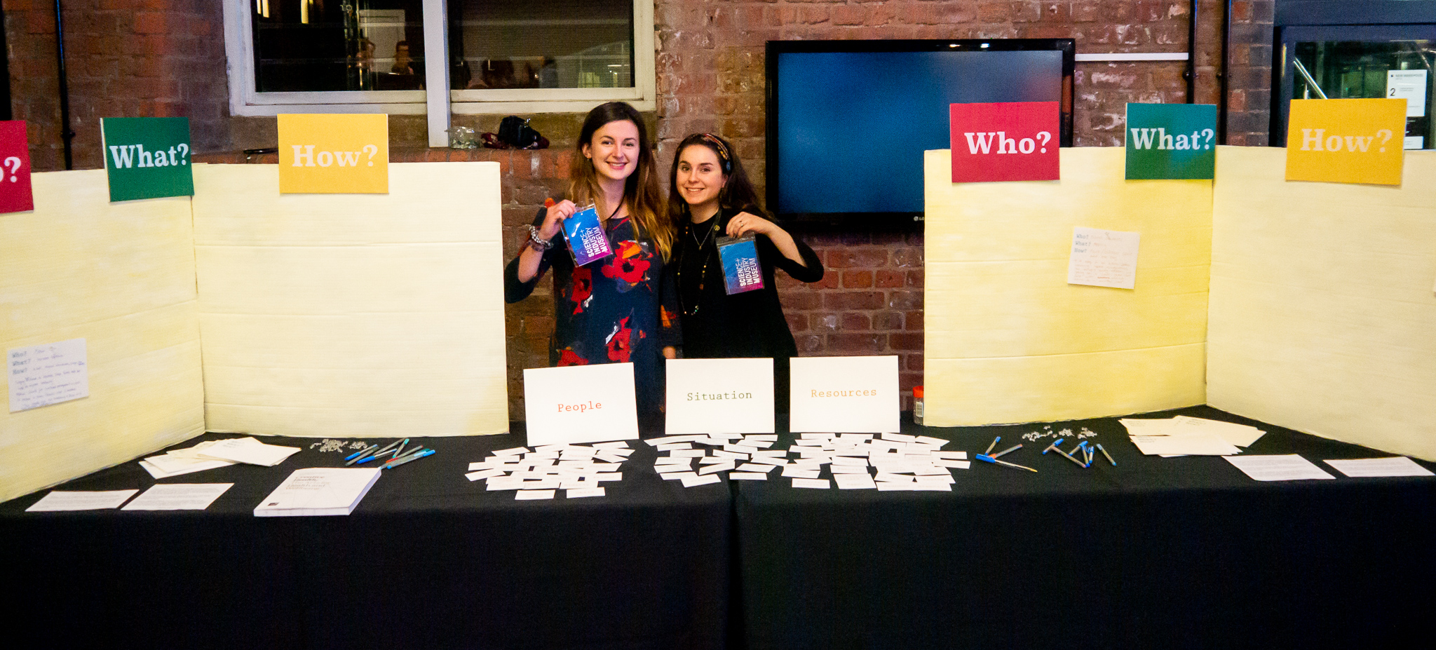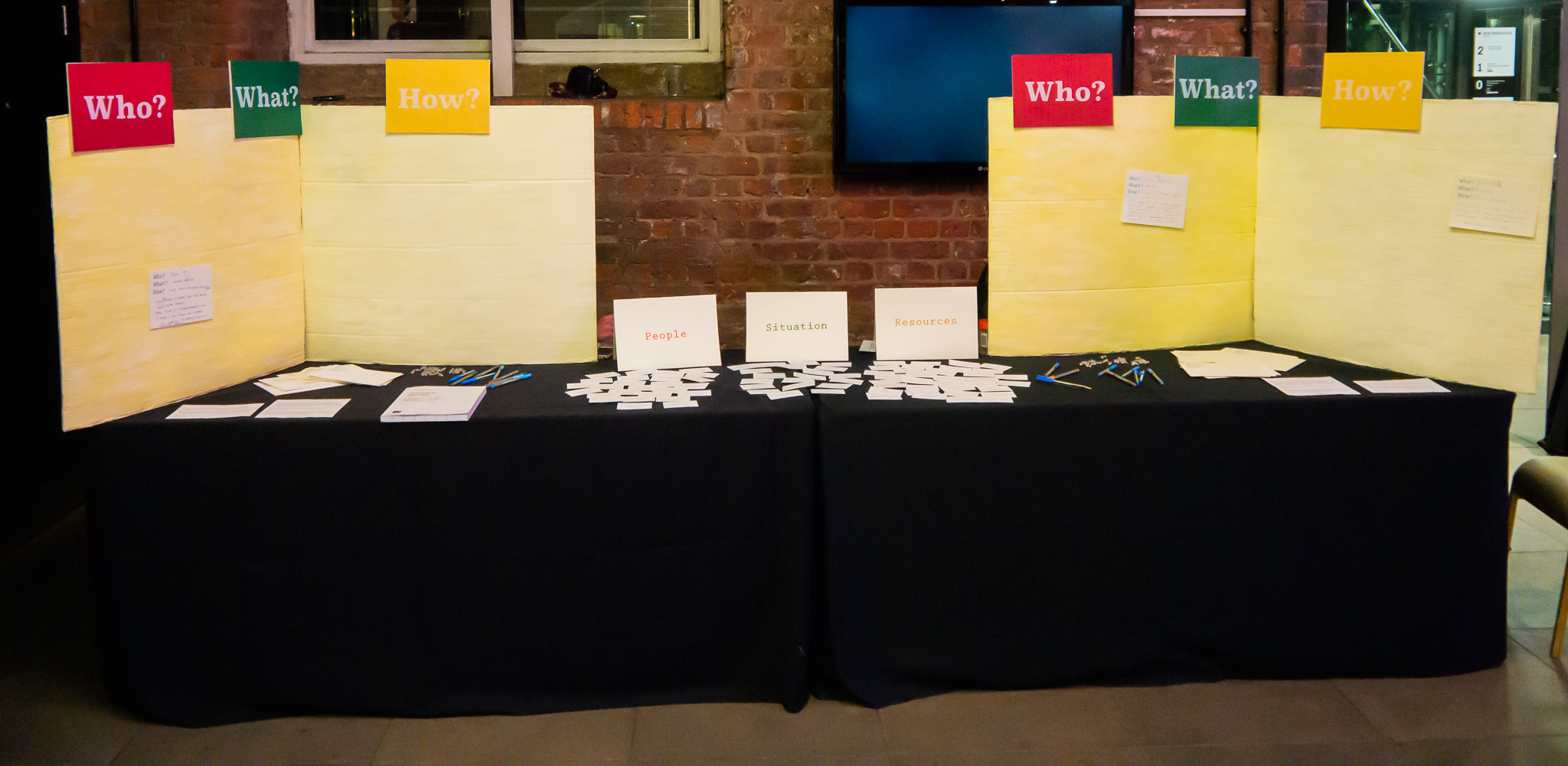 As seen below, we have screen printed answer cards: Who? What? How? where the participant will write down which cards they chose in the scenario they have chosen. Then we have provided pens to write with, and pins to stick up their answers.