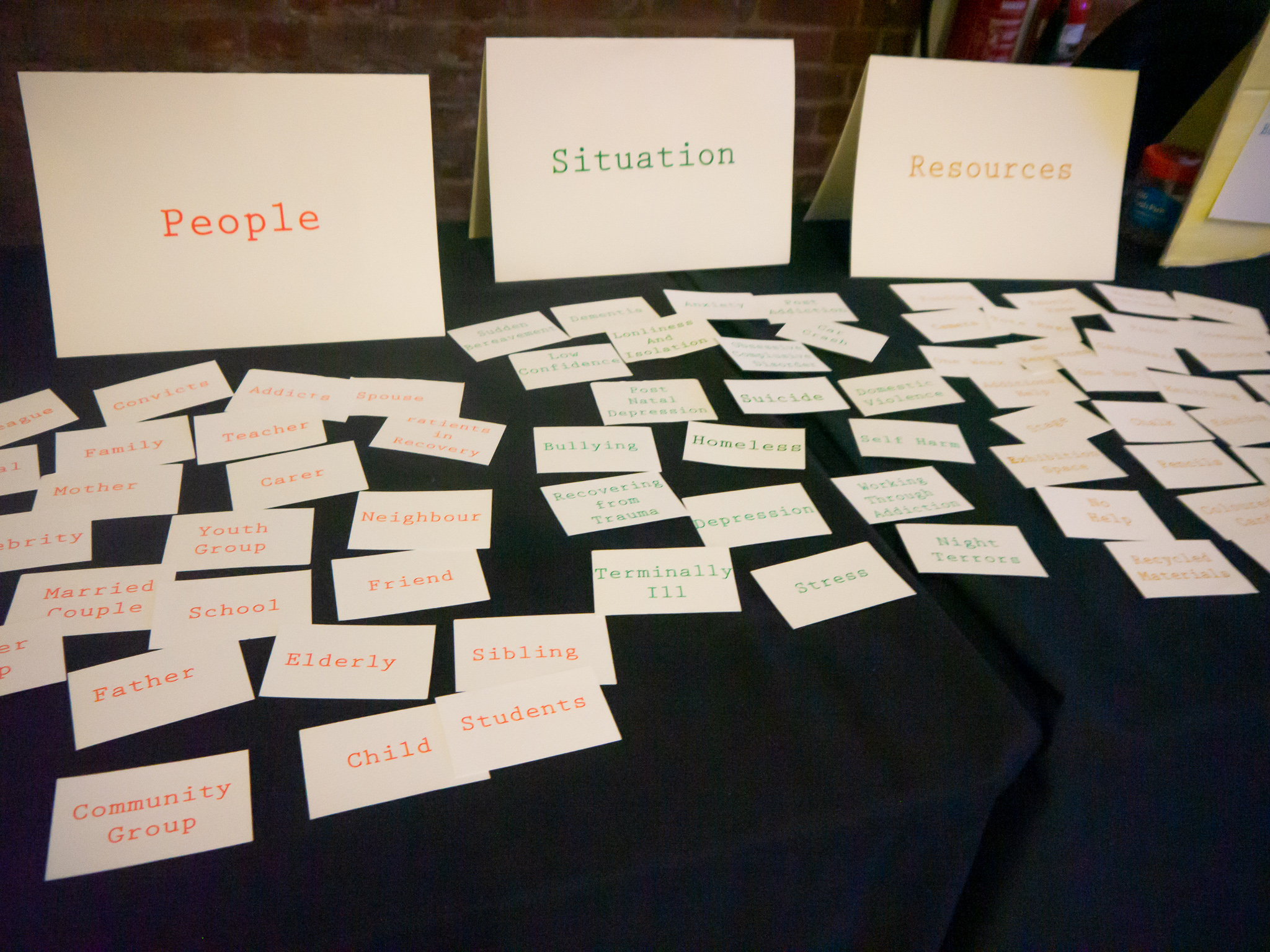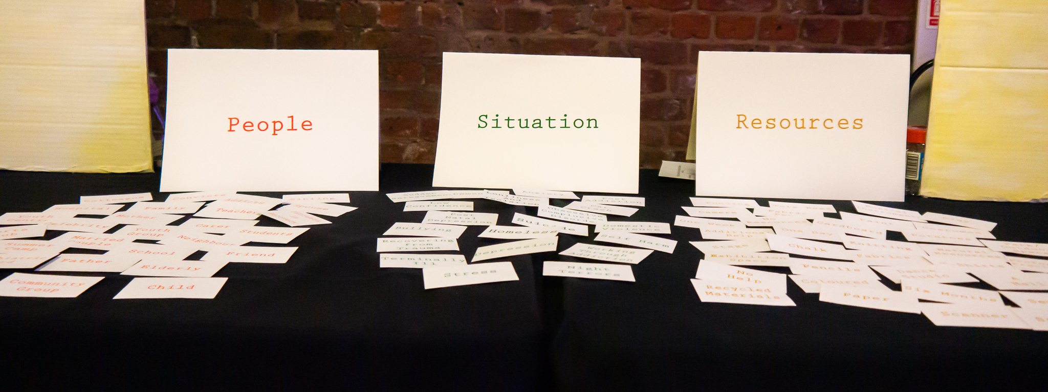 Screen printed title cards to clearly display that cards: People, situation and resources. We have tried our best to design the activity so it is visually easy to follow step by step through the process.