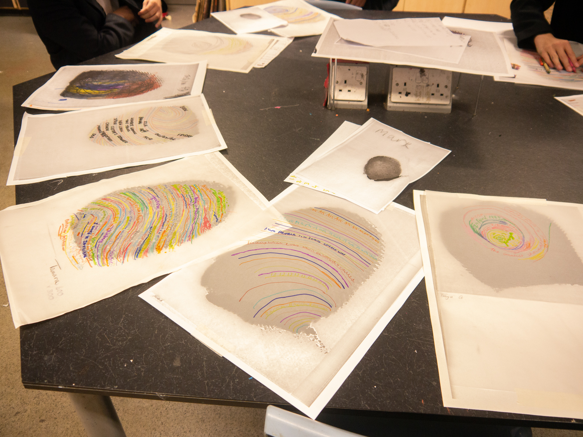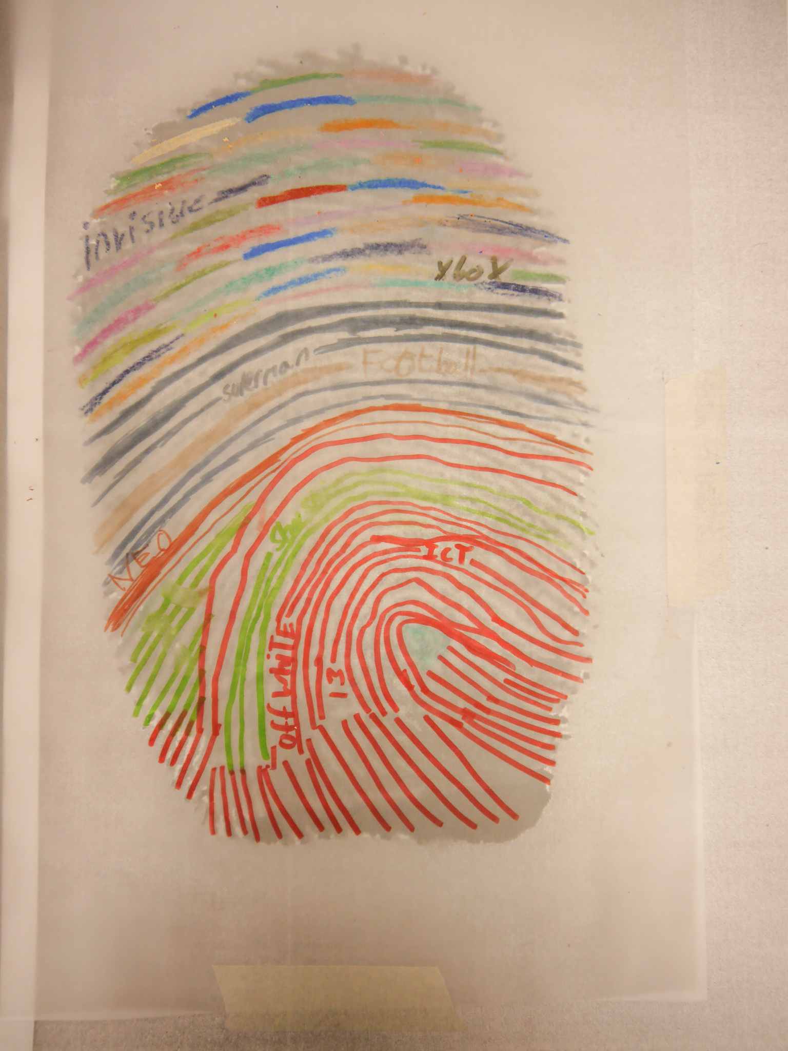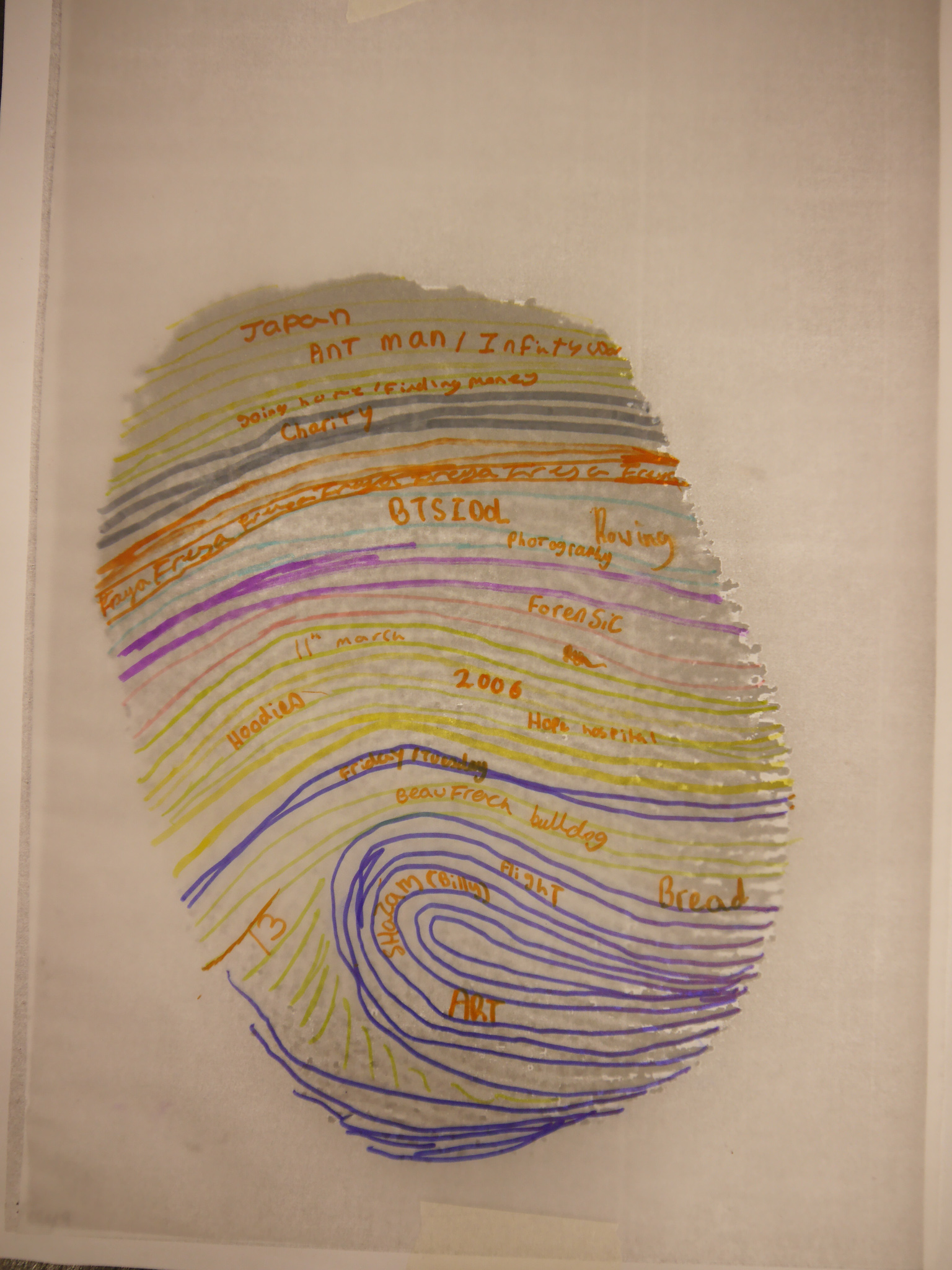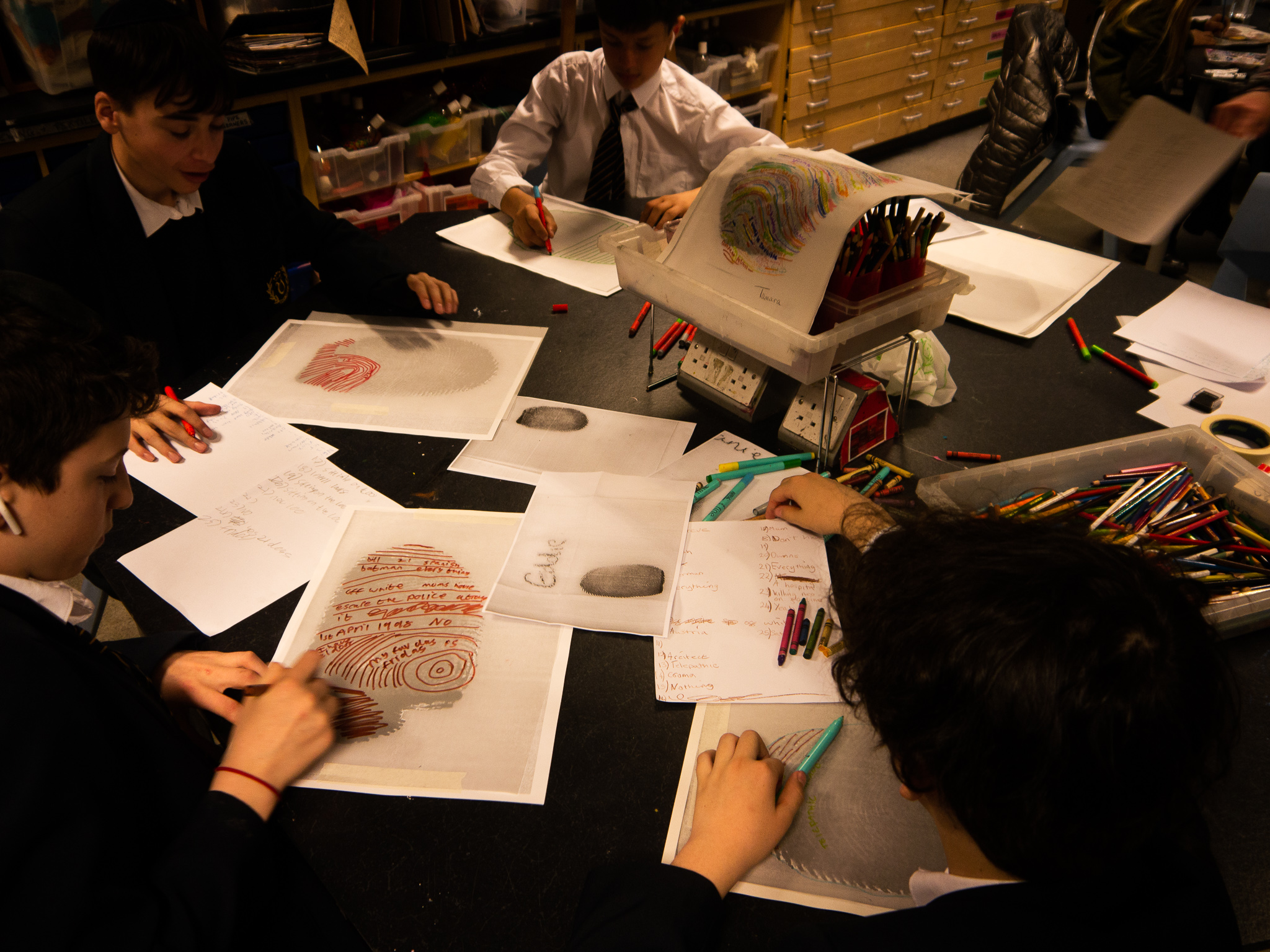 Once all the fingerprints had been copied and enlarged, the students placed tracing paper over the top and started to decorate their fingerprints using their chosen colours and writing their answers along the lines of the fingerprints.