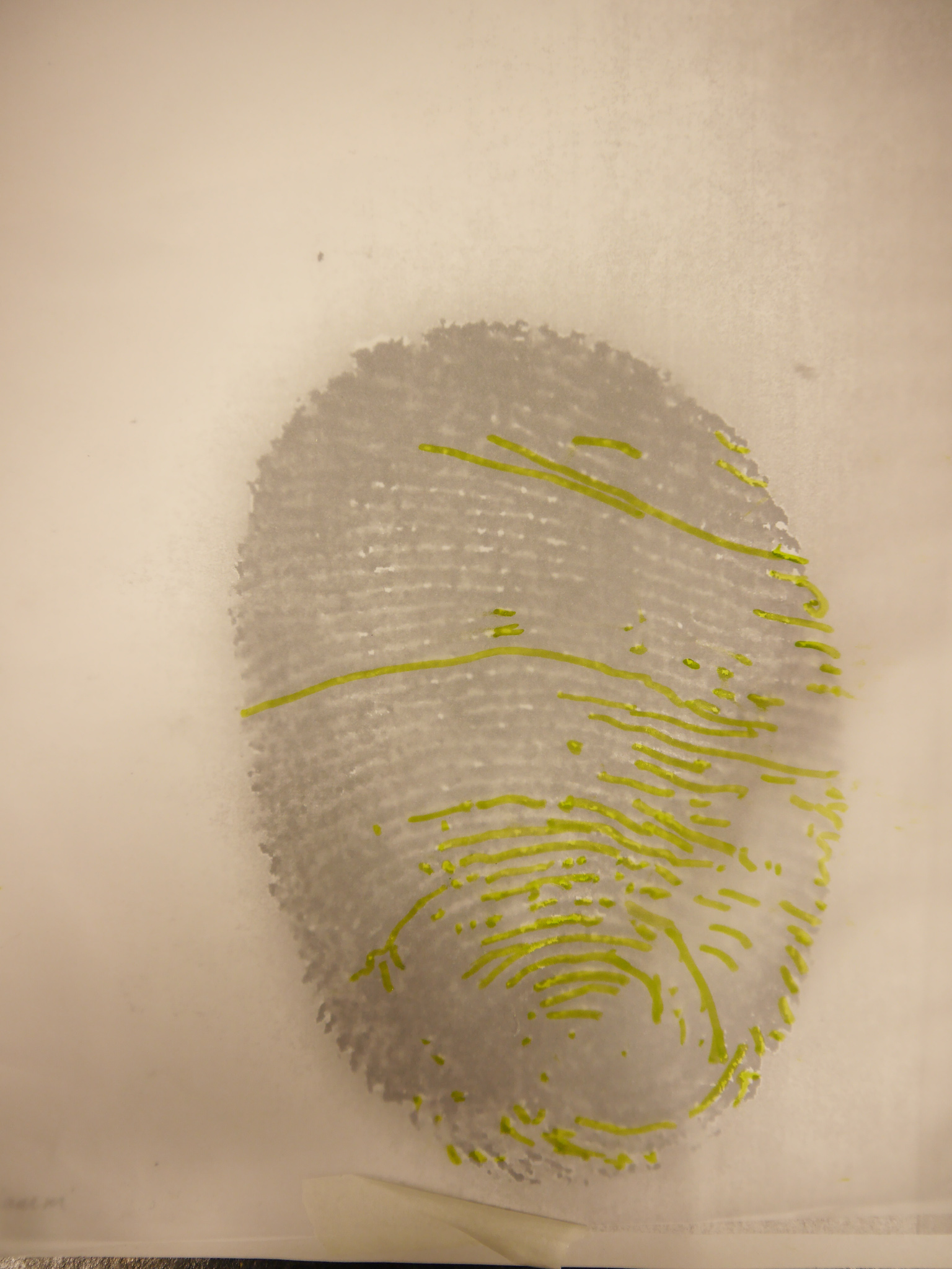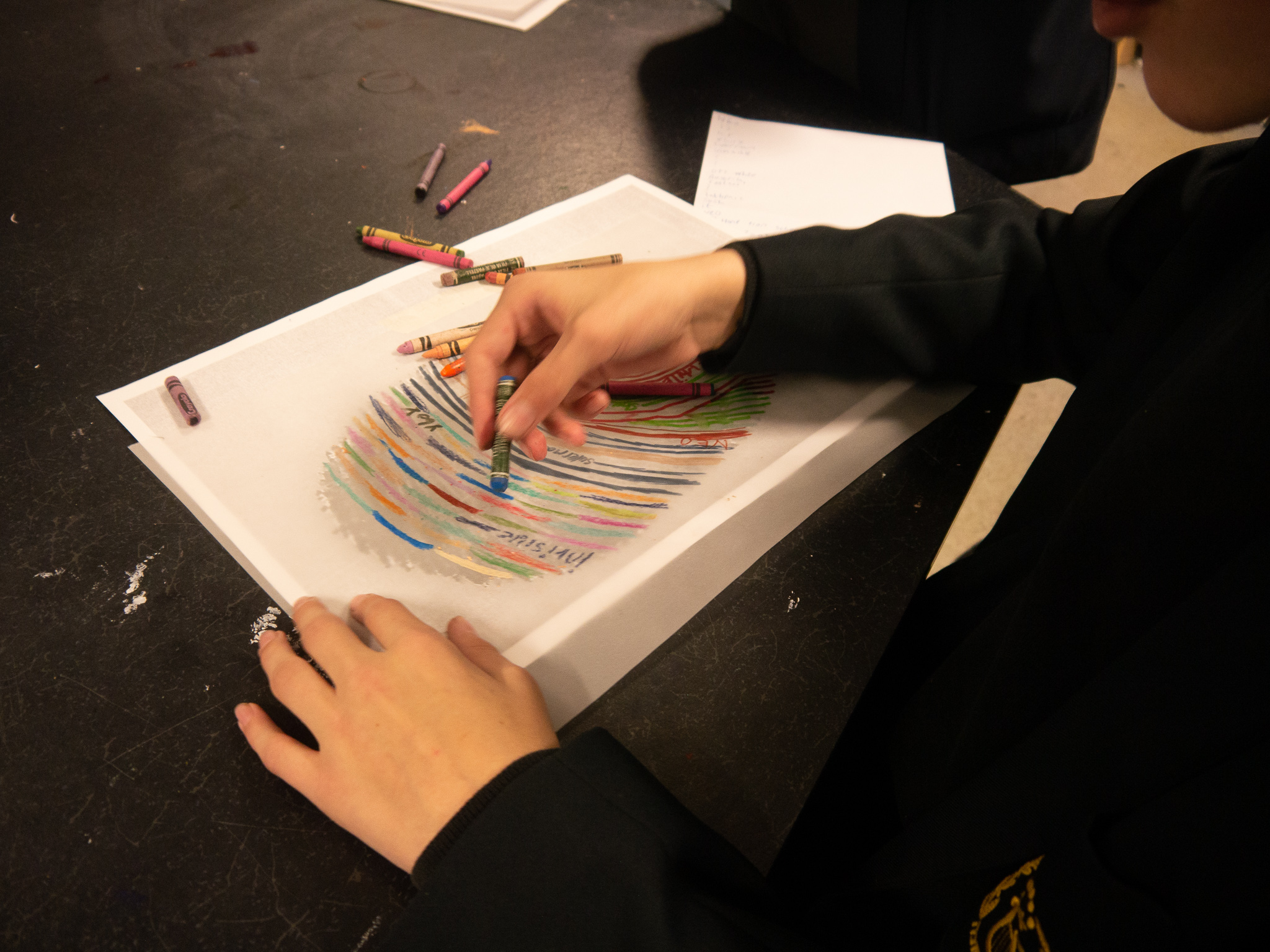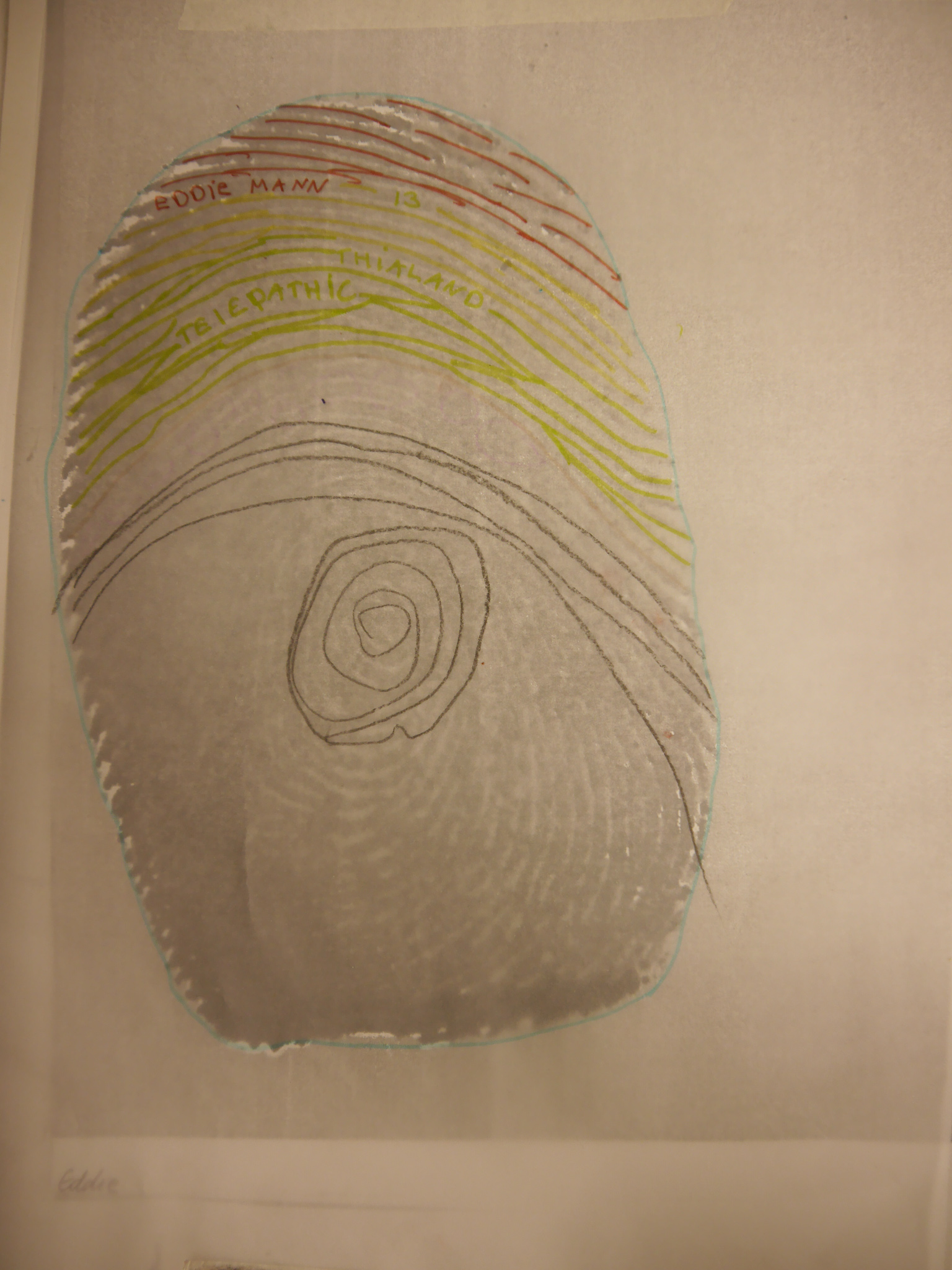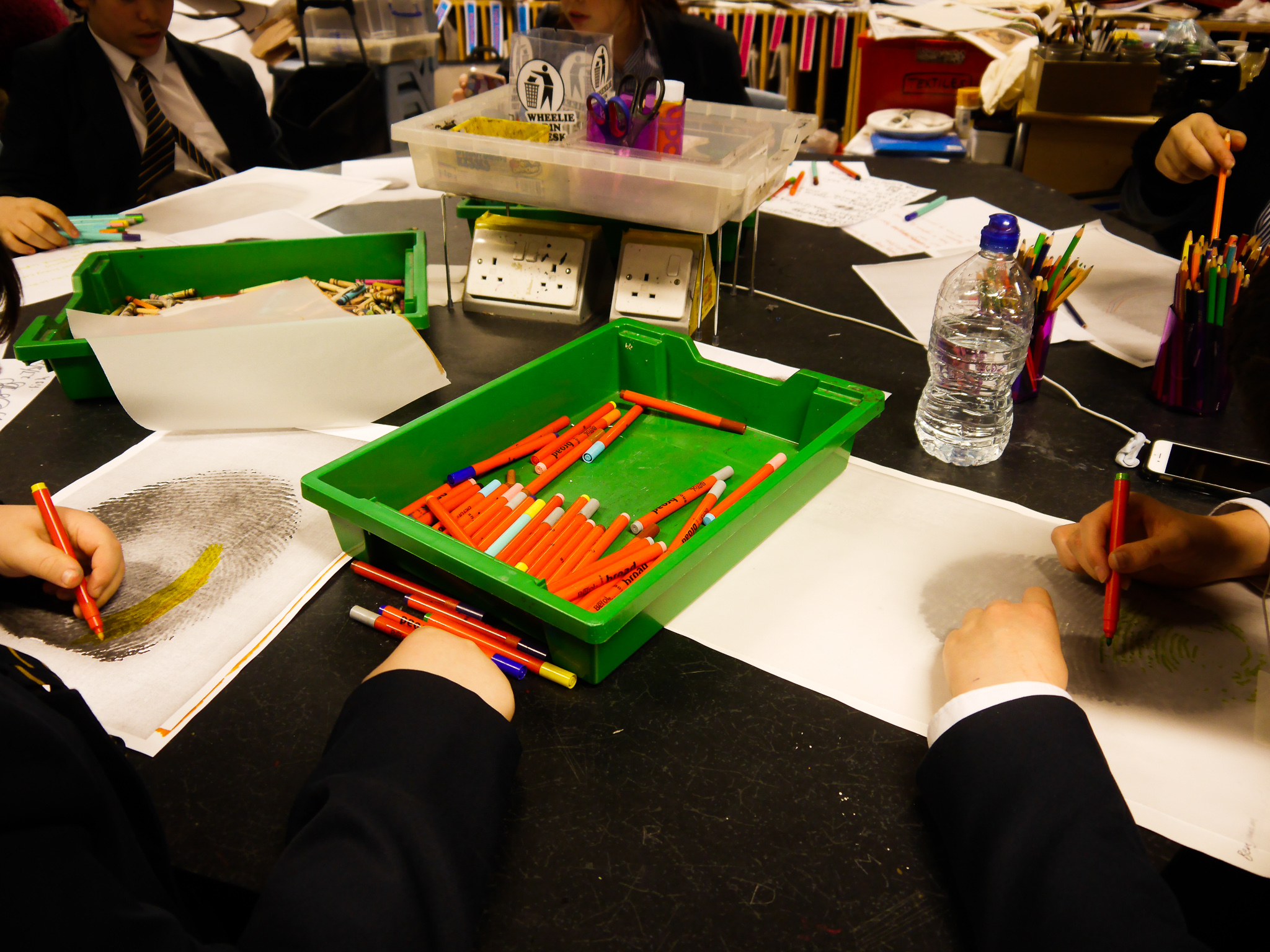 Once all the fingerprints had been copied and enlarged, the students placed tracing paper over the top and started to decorate their fingerprints using their chosen colours and writing their answers along the lines of the fingerprints.