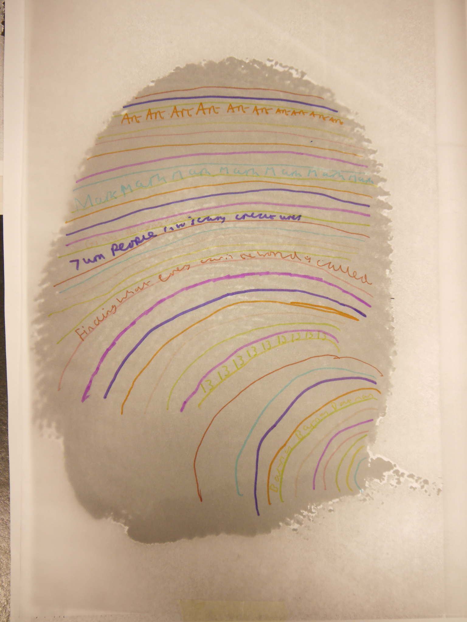 I also think that the students who worked directly on top of their fingerprint had a better and interesting outcome – so it would be important to work out fingerprints and scanning them so they don’t come out too dark. – with more time this could be edited and printed out ready, instead of just enlarging them on the photocopy.