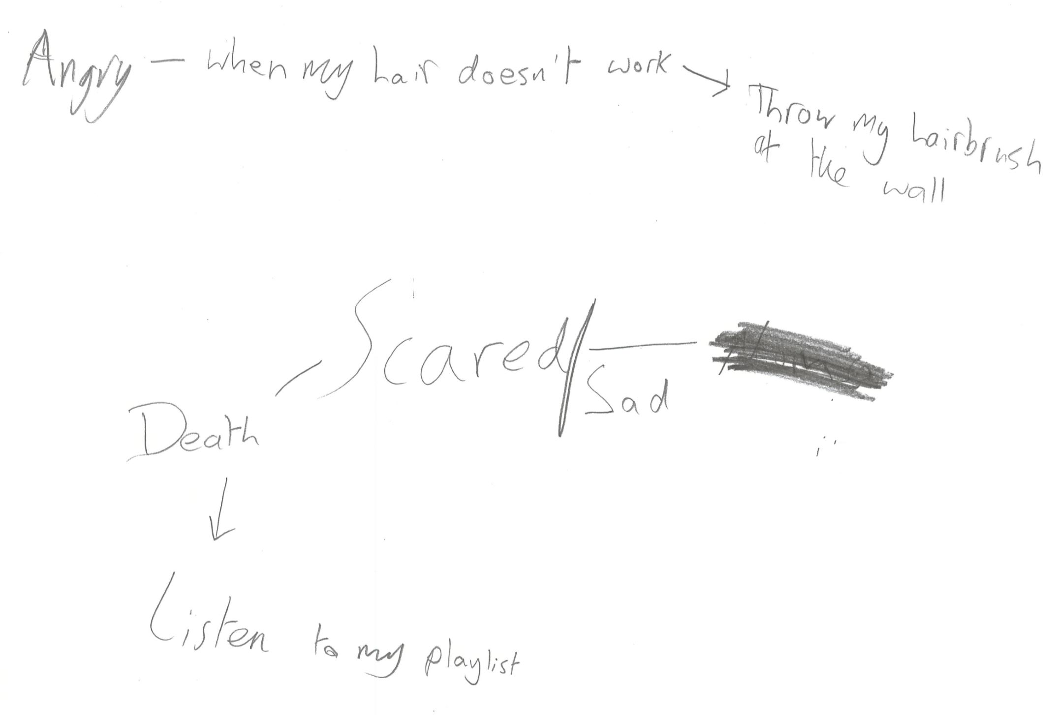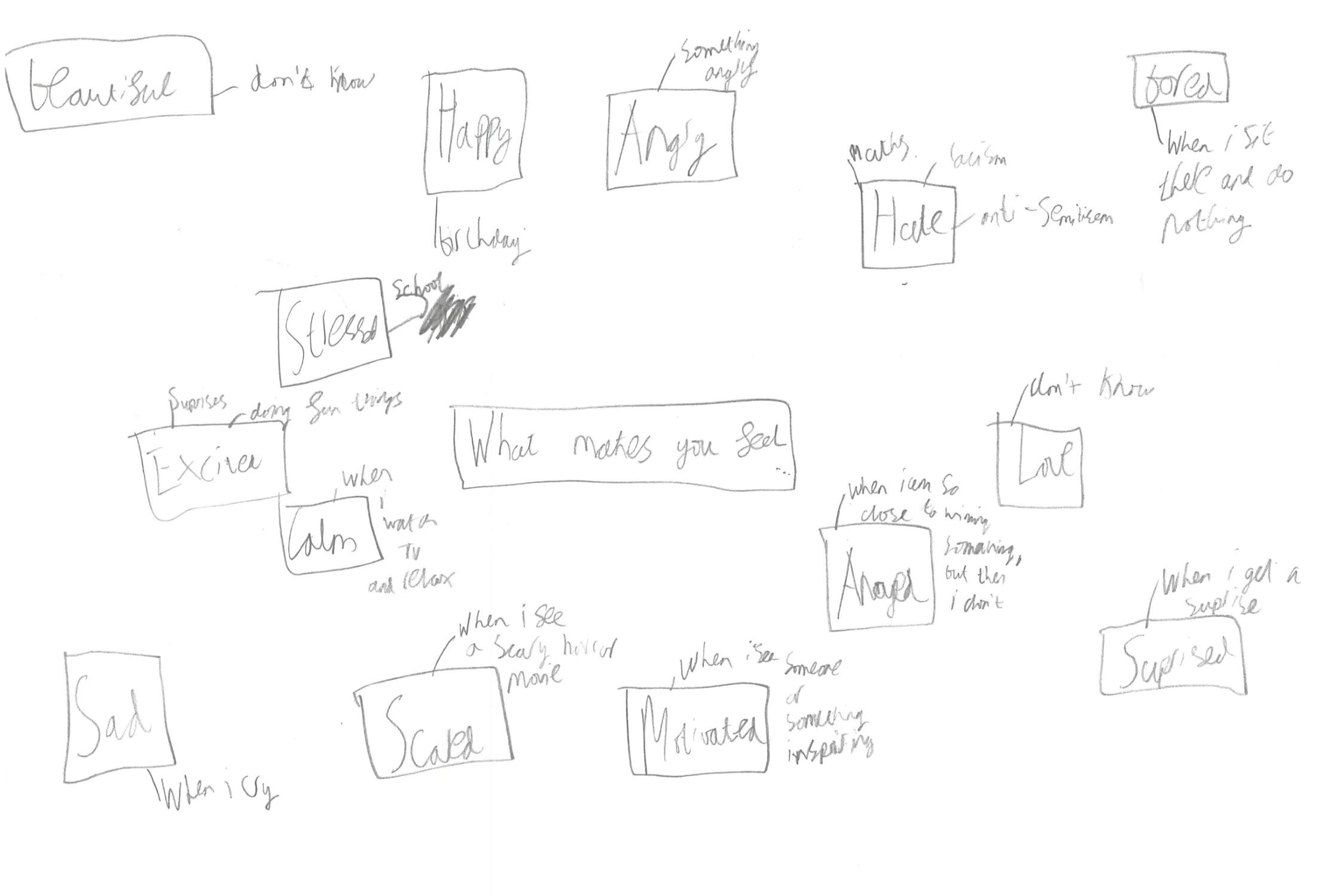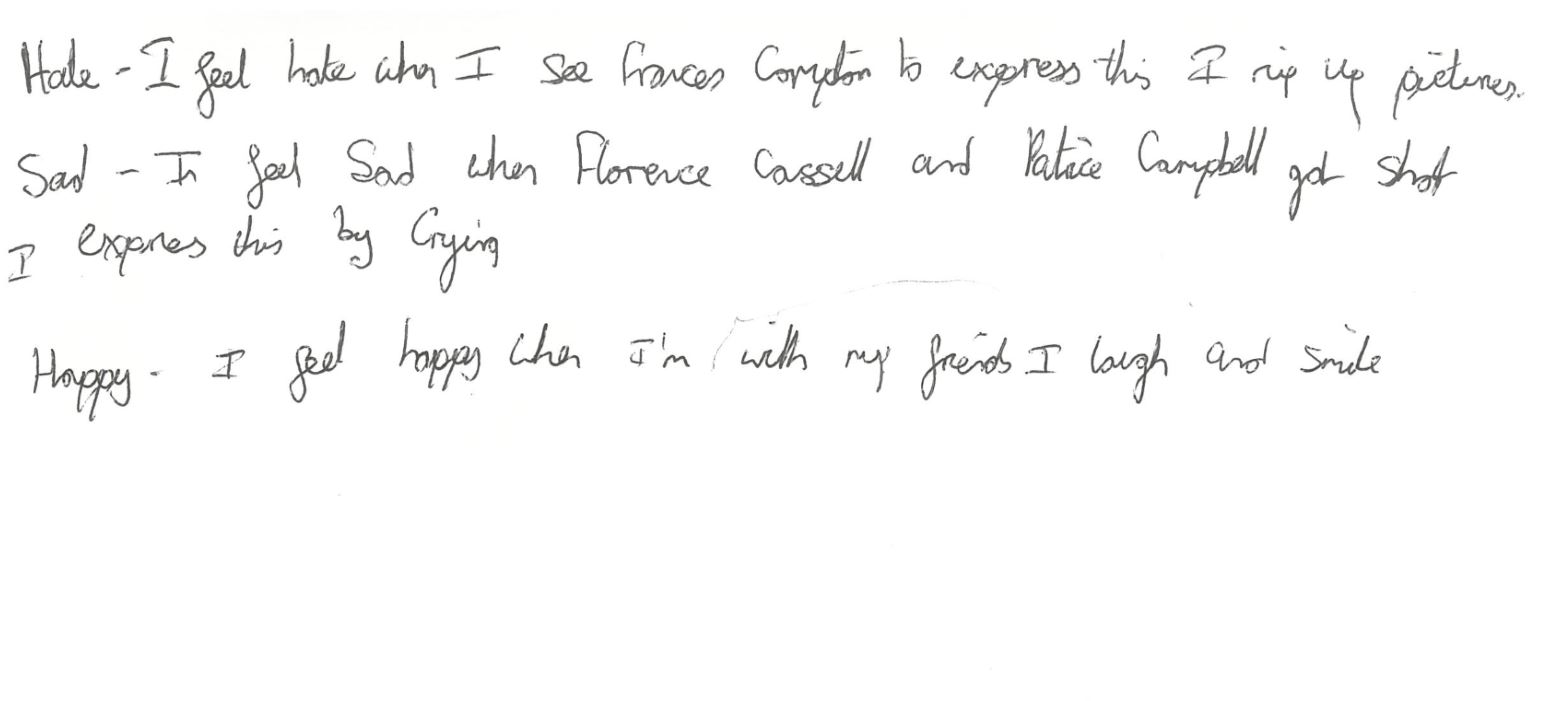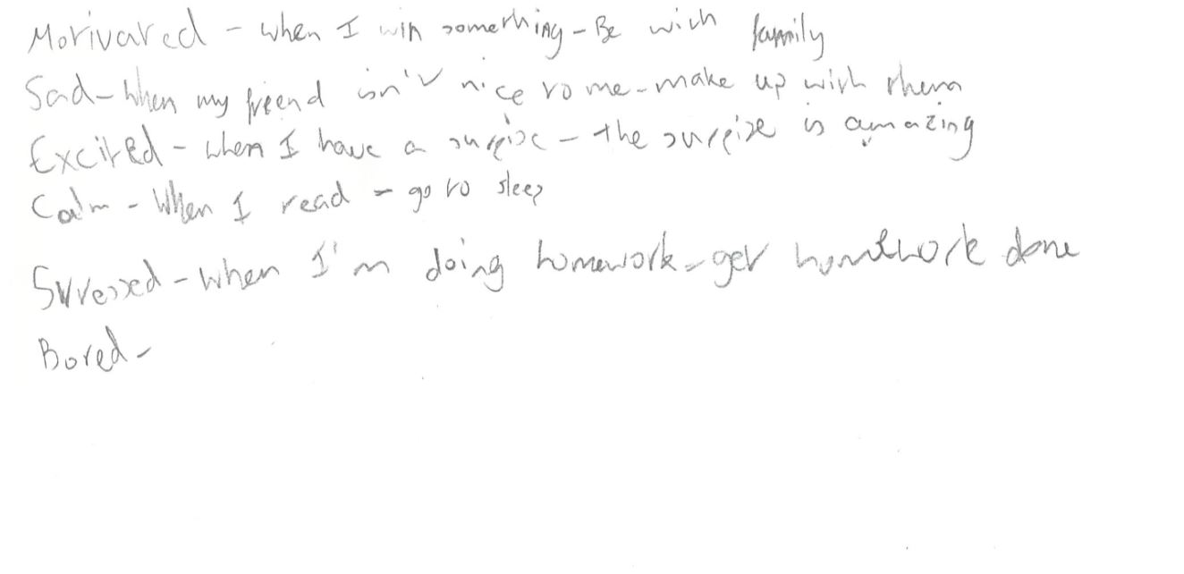 What? makes them feel….. or what the situation is that makes them feel….? How? the how is what I would like to develop and work on. I wanted to try make a clear exchange of advice and suggestions that young people could give to each other based on their mental health that involve emotions and scenarios. This wasn’t so clear to the year 7 group, and they focused on answering the base questions: What makes them feel (insert emotion) ?