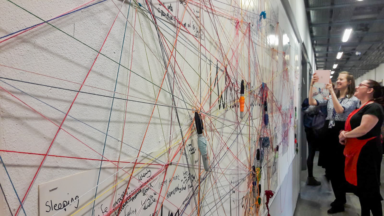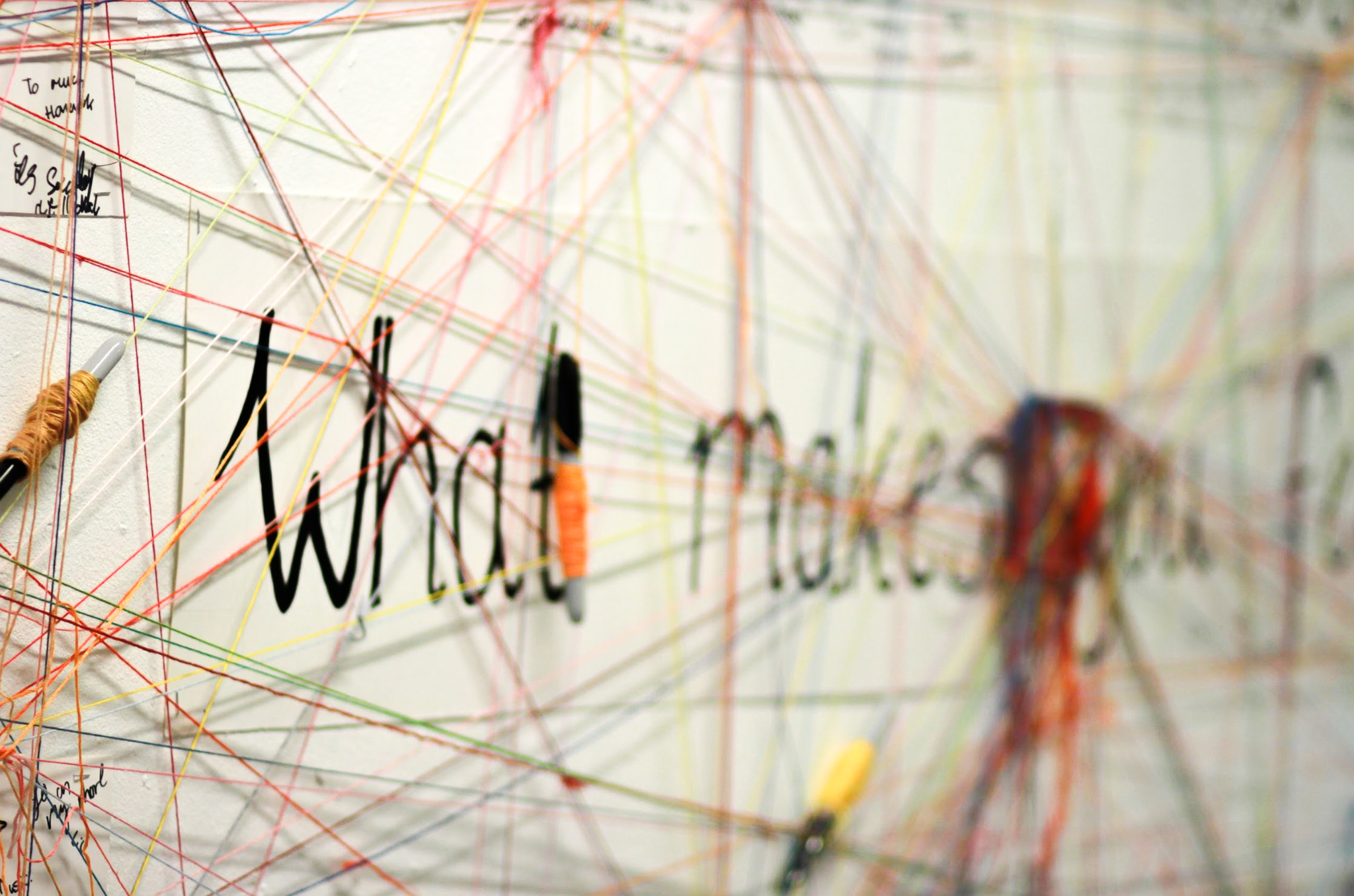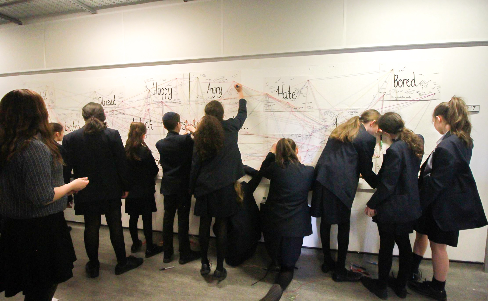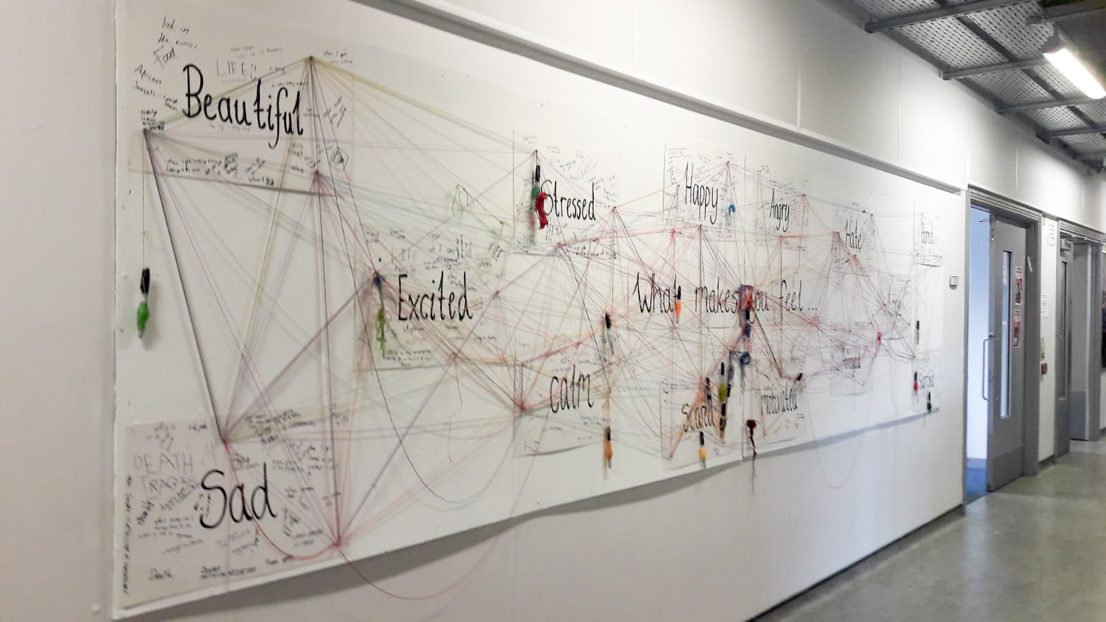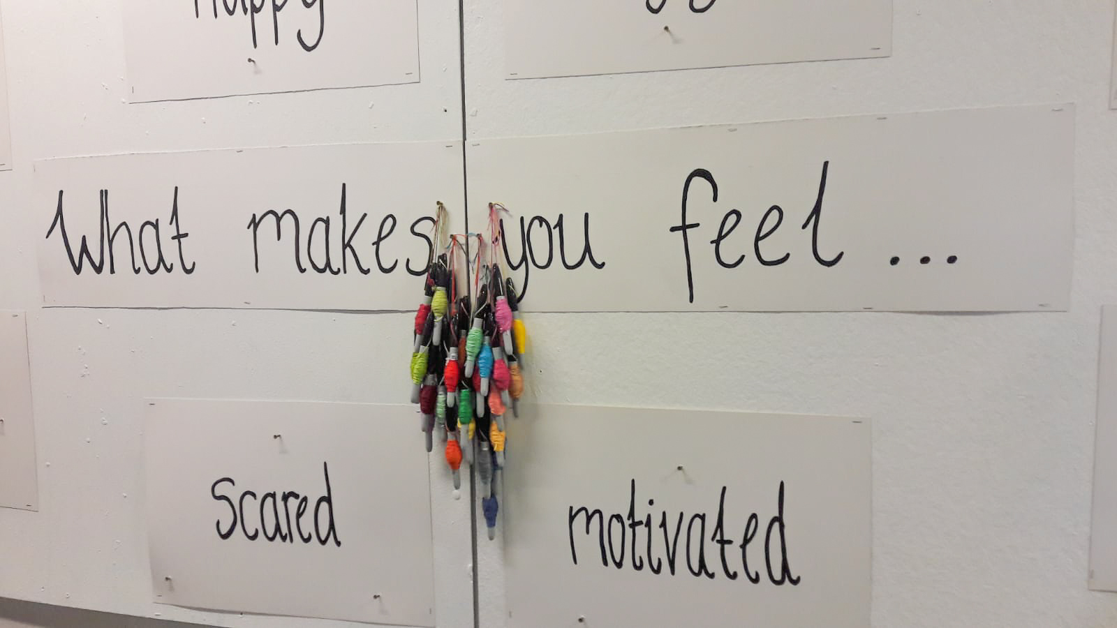 I wrapped sharpies with different coloured threads, and attacked them all hanging from a the centre of the display boards. These were attached at the question ‘What makes you feel…’ to help the workshop flow. The question is ‘what makes you feel…’ and when you get to each emotion on the board you answer the question by writing it down.