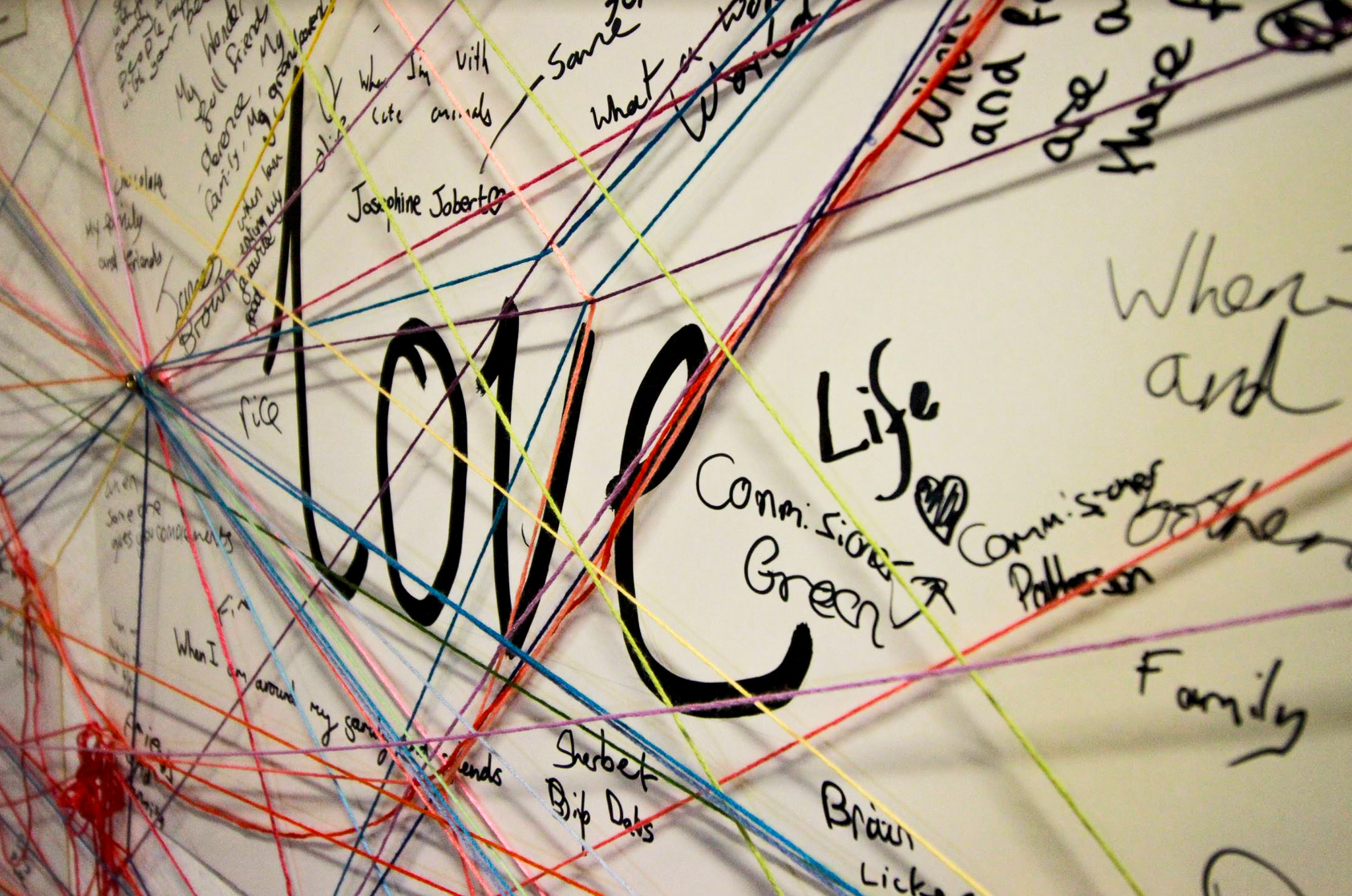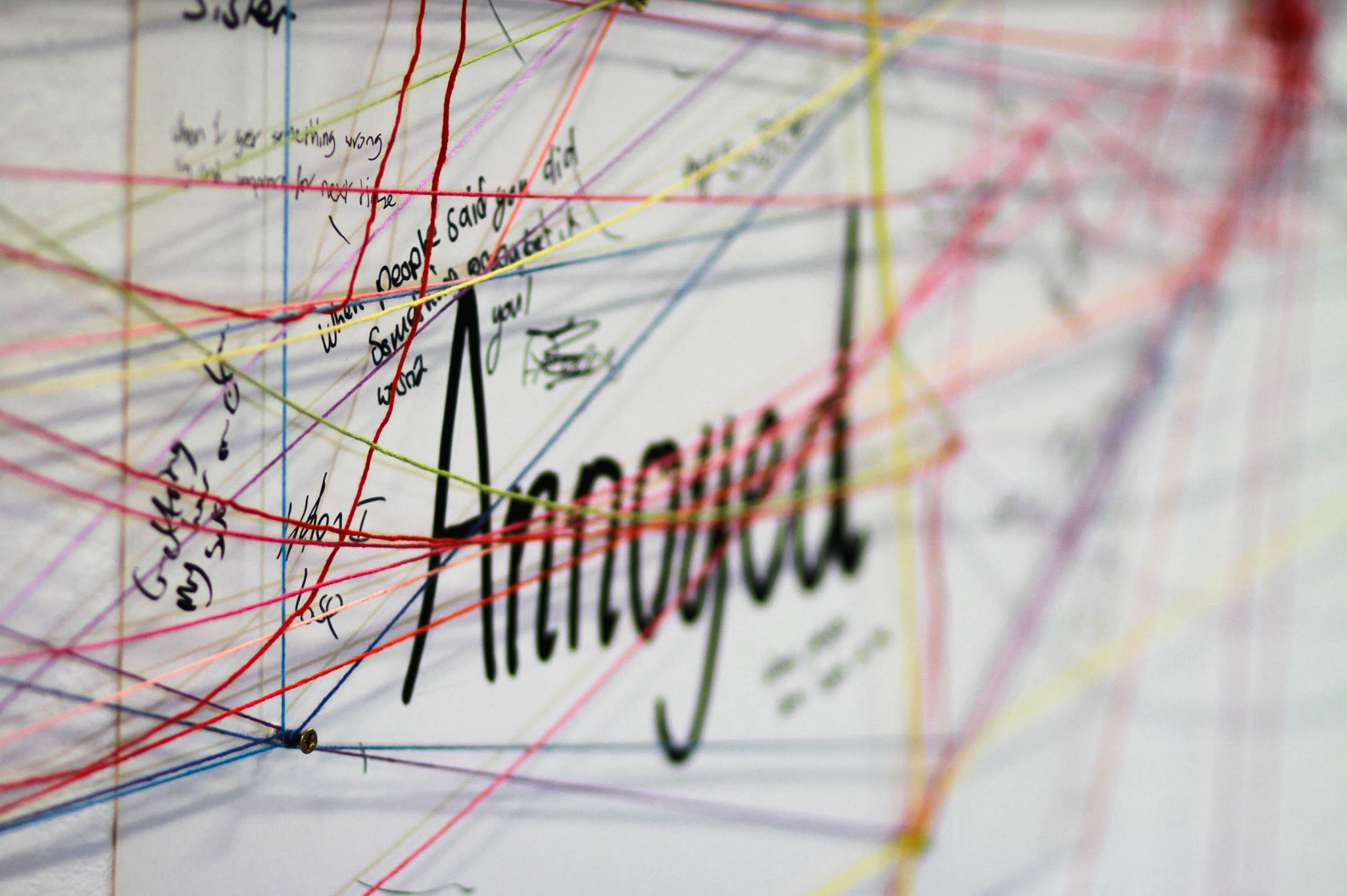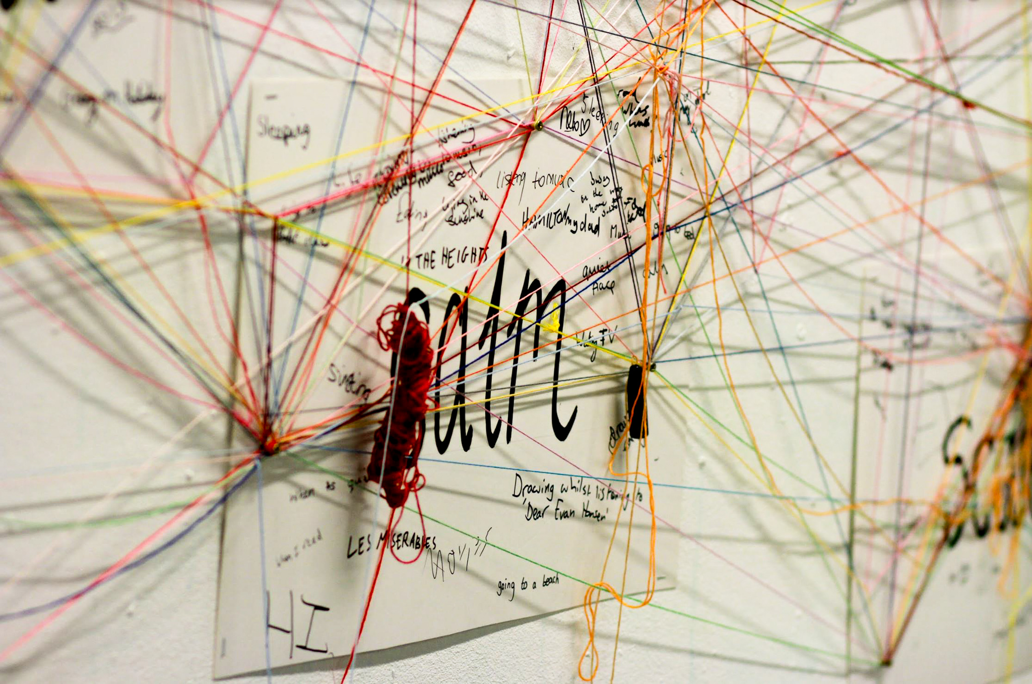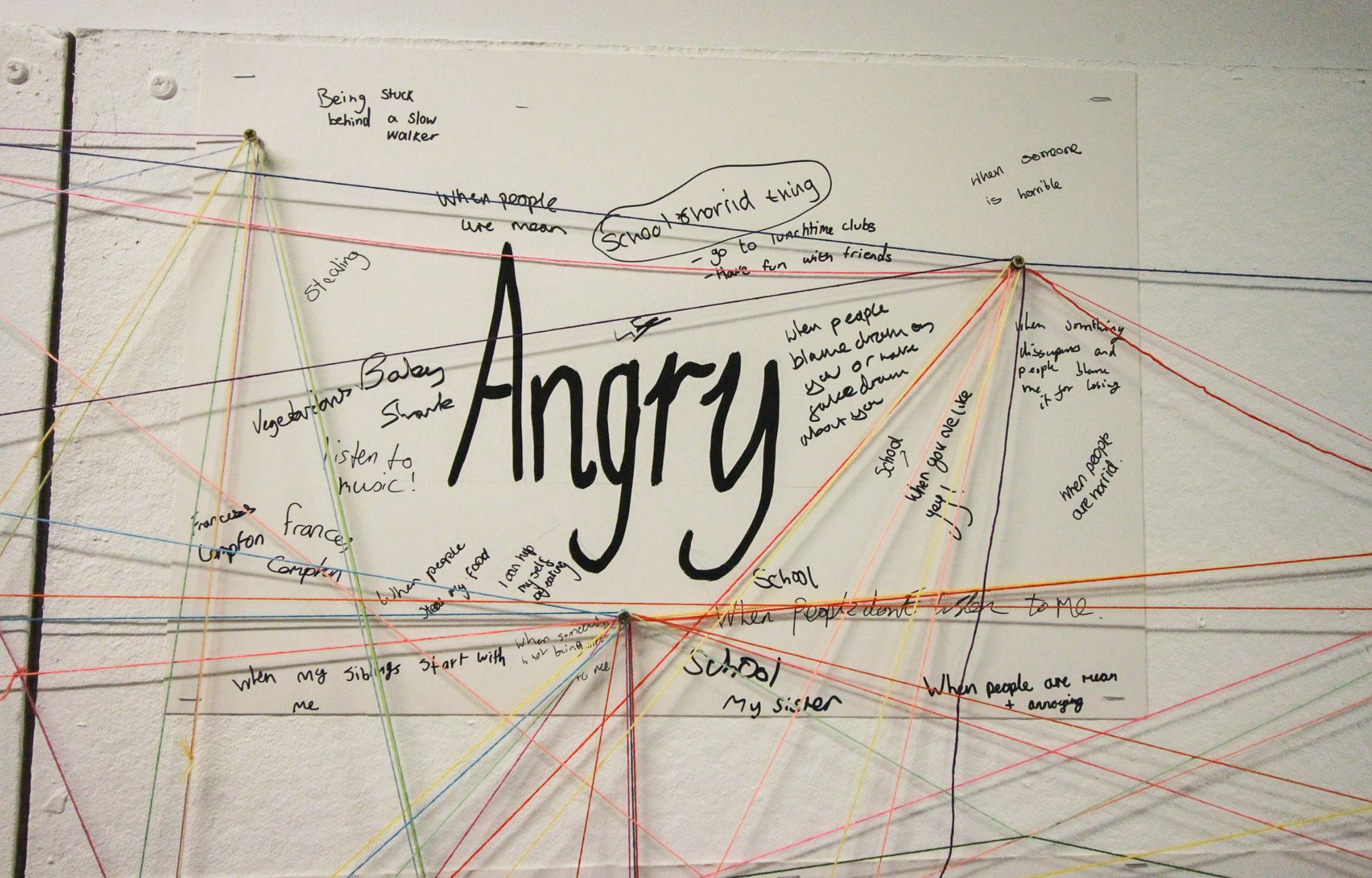 Objectives: A central focused question ‘what makes you feel?’. Connecting the thread to each emotion and writing beside each one an answer or advice for someone else based on the emotion e.g. What makes them sad? This will visually build a web of thread/ web of emotions.