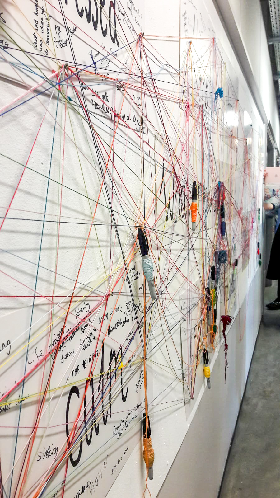 I drilled screws into different areas across the display board so the student would wrap the threads around each point, making connections and their own path, mapping out their journey through the activity.