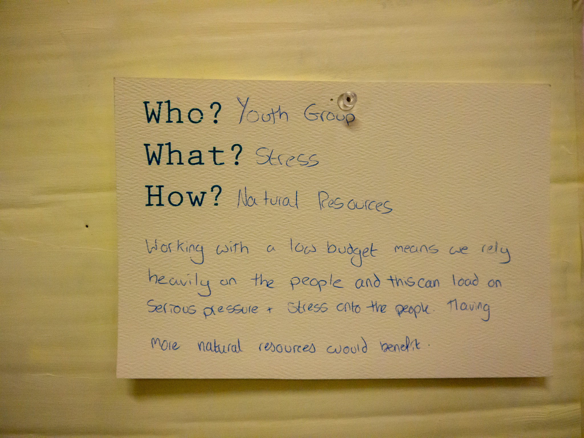 Youth Group, therefore fun and in free time, an activity they can come and go from, more drop in. I think Mahdlo should be more based on slowing down- teenage life is hectic, so if they stop by for 5 mins/ one hour etc research some slow workshop ideas, perhaps try and encourage a conversation about the benefits of slowing down, how and when they could do this in their lives, and why this is important.